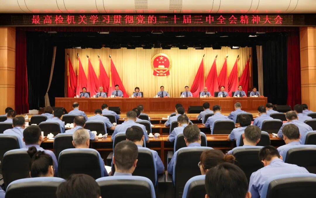 7月19日,最高人民检察院先后召开党组会、机关党员干部大会,传达学习党的二十届三中全会精神,结合检察工作实际,研究初步贯彻落实举措。最高检党组书记、检察长应勇主持会议并强调,各级检察机关要切实把思想和行动统一到党的二十届三中全会精神上来,深刻领会和把握新时代以来全面深化改革的成功实践和伟大成就,深刻领会和把握进一步全面深化改革的重大意义、总体要求、重大举措和根本保证,深刻领会和把握进一步全面深化法治领域改革的重点任务,自觉融入进一步全面深化改革、推进中国式现代化伟大实践,充分履行检察职能,运用法治力量服务党中央改革决策部署落实,进一步全面深化检察改革,加快推进检察工作现代化,更好支撑和服务中国式现代化。