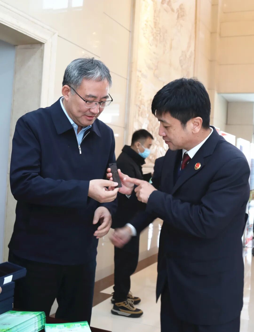 全国人大代表白景阳(右一)参观吉林市龙潭区检察院“四叶草”未成年人法治教育基地小太阳留言区,对该院设计的“龙小卫”法律徽章给予充分肯定。