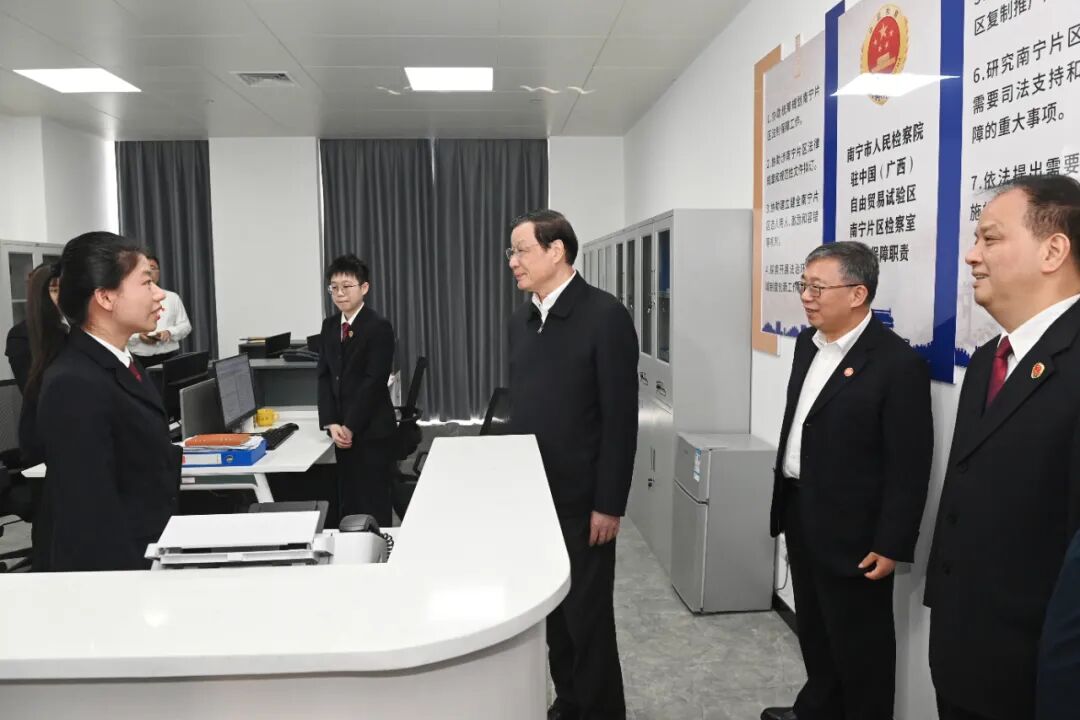 3月27日,最高人民检察院党组书记、检察长应勇率最高检调研组来到南宁市检察院派驻中国(广西)自贸试验区南宁片区检察室调研。